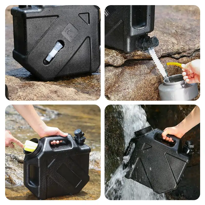 Tog denne vandbeholder med på en fire-dages campingtur med børn. Hanen hælder jævnt, uden lækager, og det var nemt at gøre den brede åbning ren.