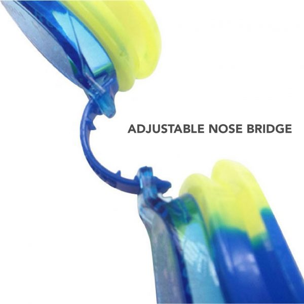 ✔️ BEHAGELIG & JUSTERBAR — En justerbar hovedrem og næsebøjle sikrer den perfekte pasform. En blød ramme former sig efter ansigtet for en sikker pasform, mens brudsikre linser giver uafbrudt komfort til små svømmere.