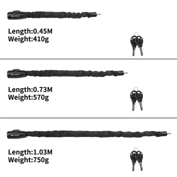 Den opgraderede forlængede bøjle med højestyrke legeringsstål er længere og mere praktisk. Den fås i forskellige længder: 0,45m – 1,45m. En halvmåneformet nøgle reducerer effektivt den gensidige åbning og modstår tyvenes metoder. Denne cykellås kan låse flere cykler eller motorcykler på samme tid. Den kan også bruges til stiger, porte, hegn, værktøjskasser, sportsudstyr og andre vigtige ting. Perfekt til at fastlåse din cykel til et træ eller gelænder.