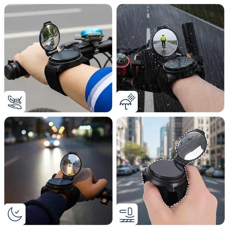 Threo håndledsspejl giver dig et klart udsyn bagtil. Det hjælper dig med at undgå pludselige overraskelser fra hurtige køretøjer. Du kan have spejlet på i flere timer uden ubehag.