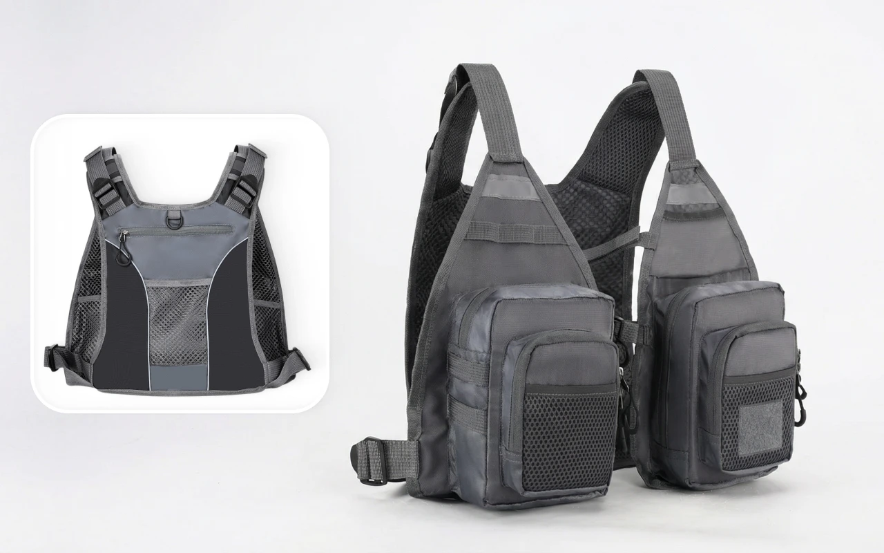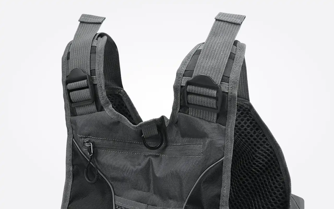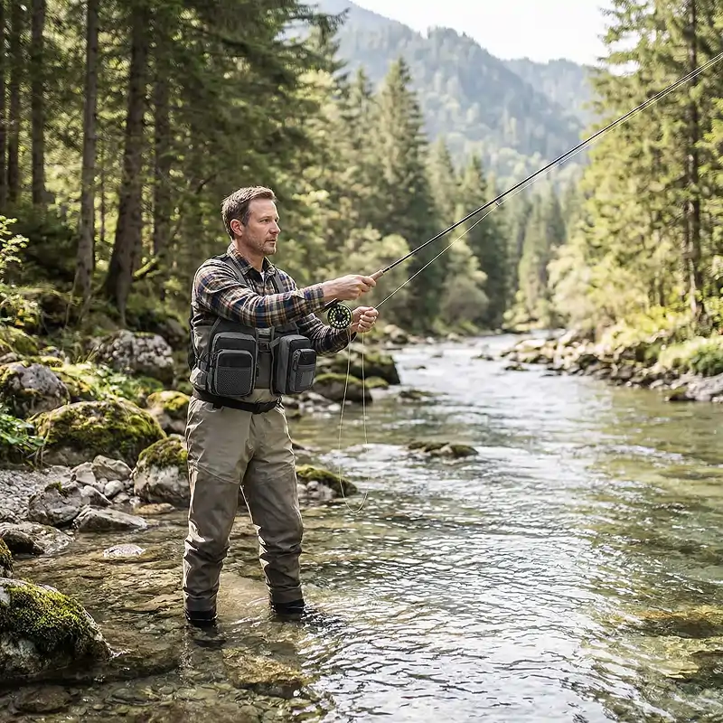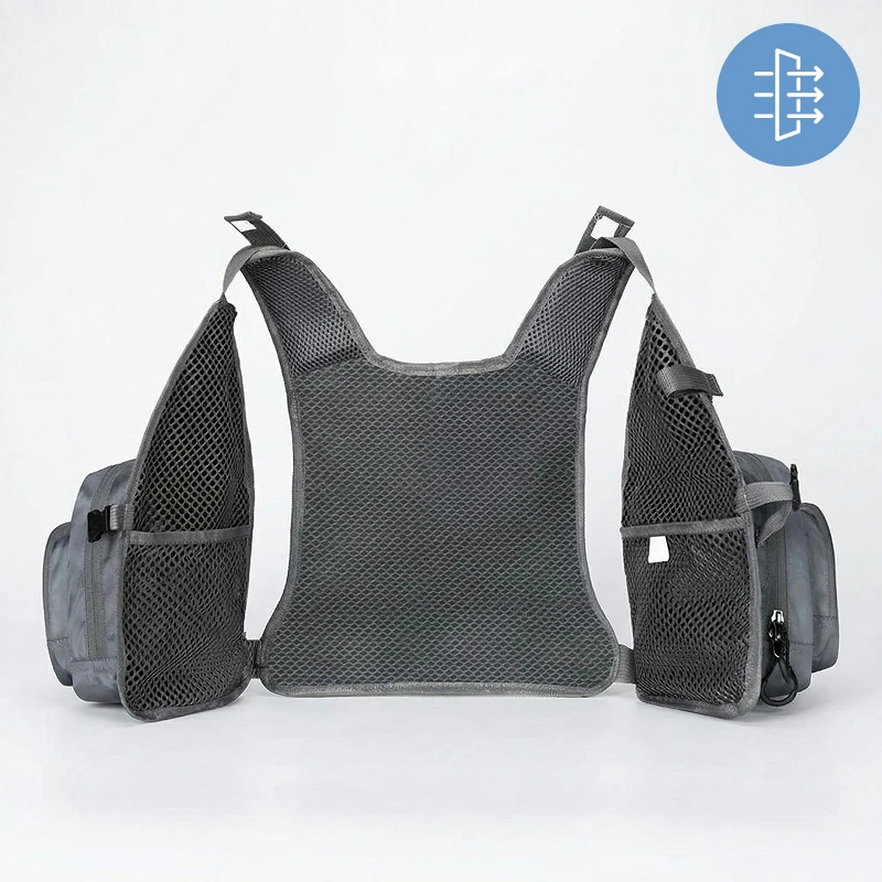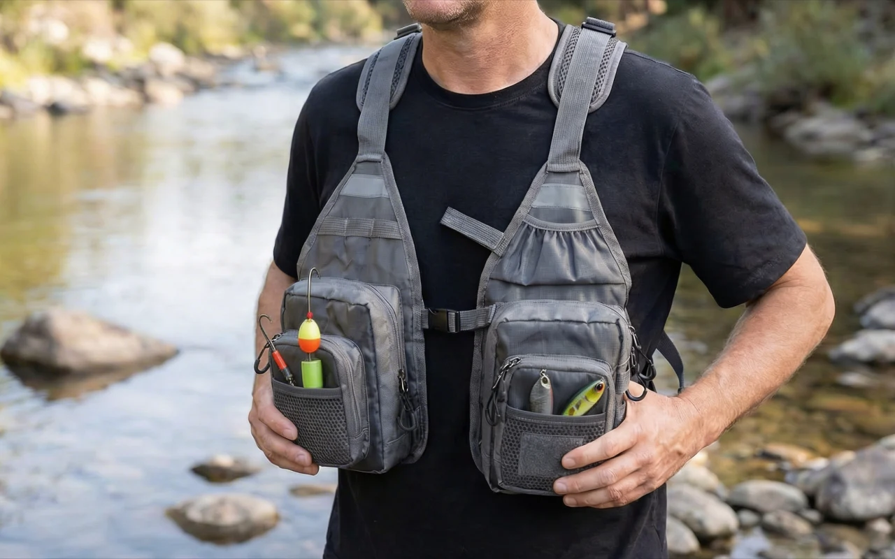 Jeg bruger dette lette brystetui, når jeg vandrer til afsidesliggende bække. Det rummer æsker, forfang, snacks og en lille vandflaske, samtidig med at mine skuldre forbliver komfortable hele dagen.