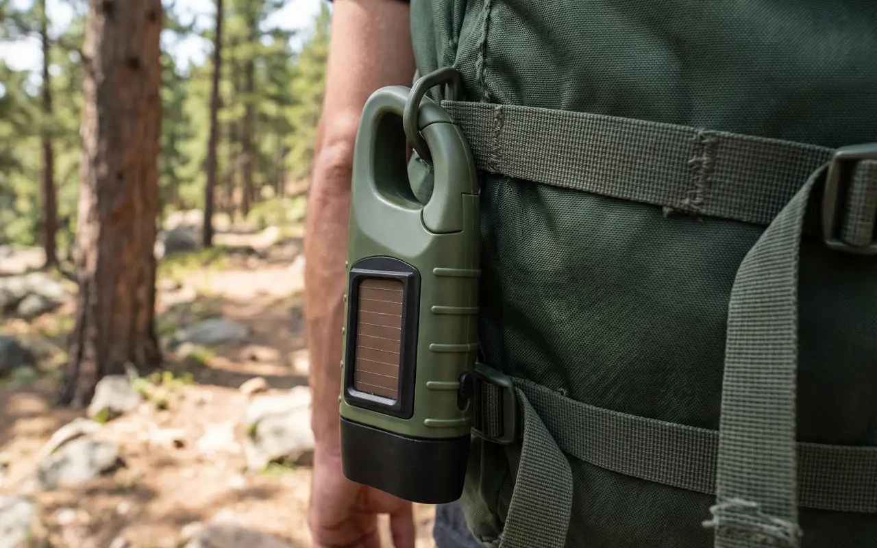 Jeg klipser denne sollygte på min rygsæk til aftenture med hunden. Den lader op i løbet af dagen og lyser så kraftigt på sti og vej.