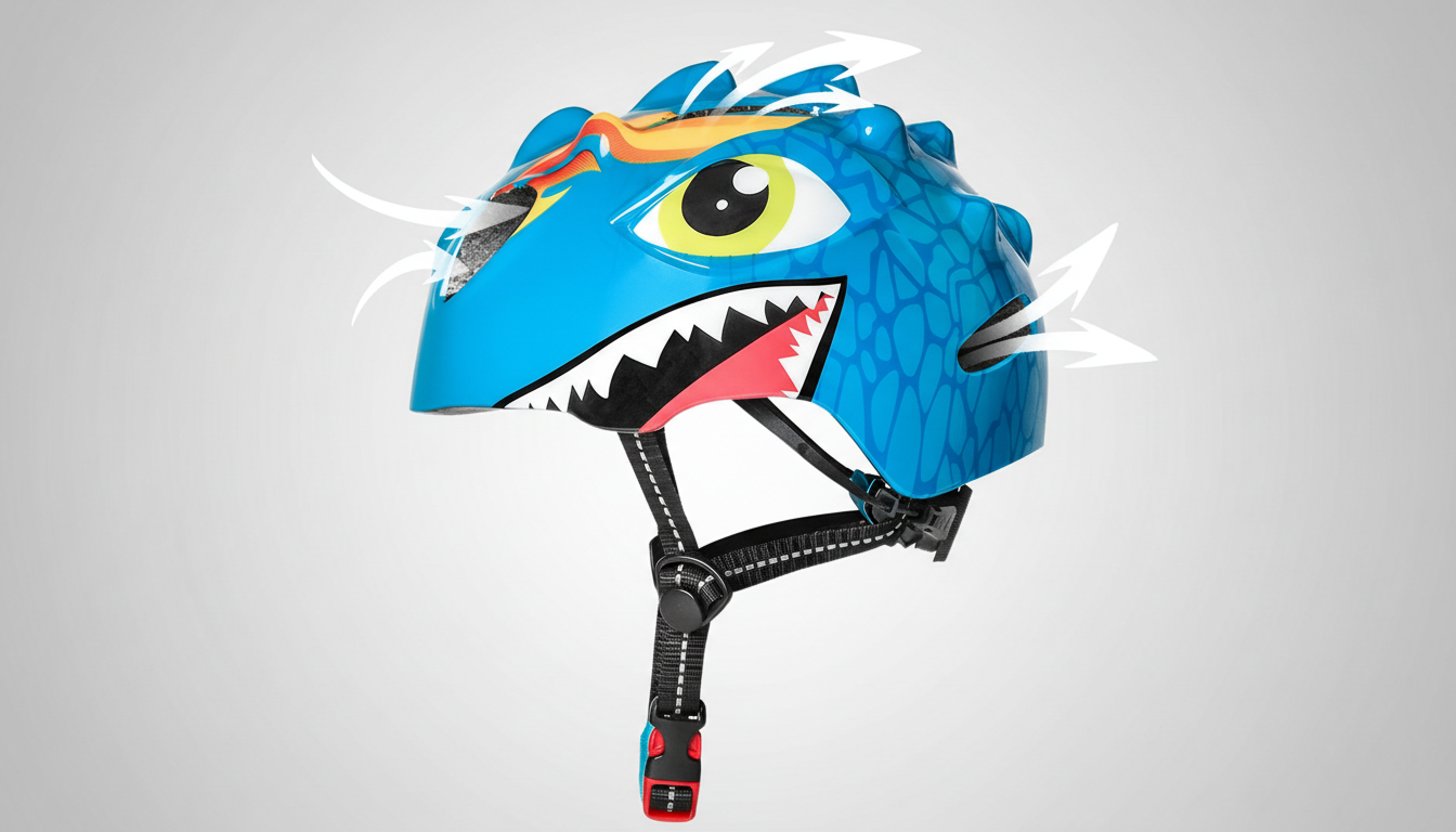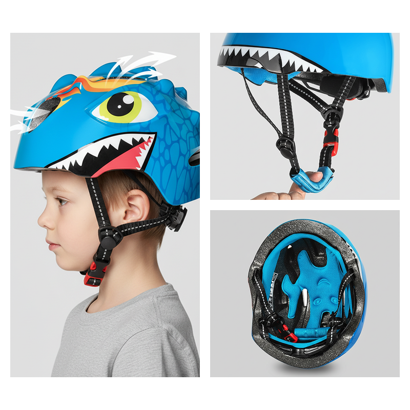 Dinosaur-hjelmen bliver siddende på min søns hoved og har allerede klaret et par fald uden en skramme. Kan klart anbefales til yngre børn.