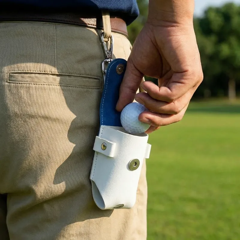 Hænger direkte på mit bæltestrop og er super nem at bruge! Knappen lukker tæt, og intet falder ud, selv når jeg løber til næste hul.
