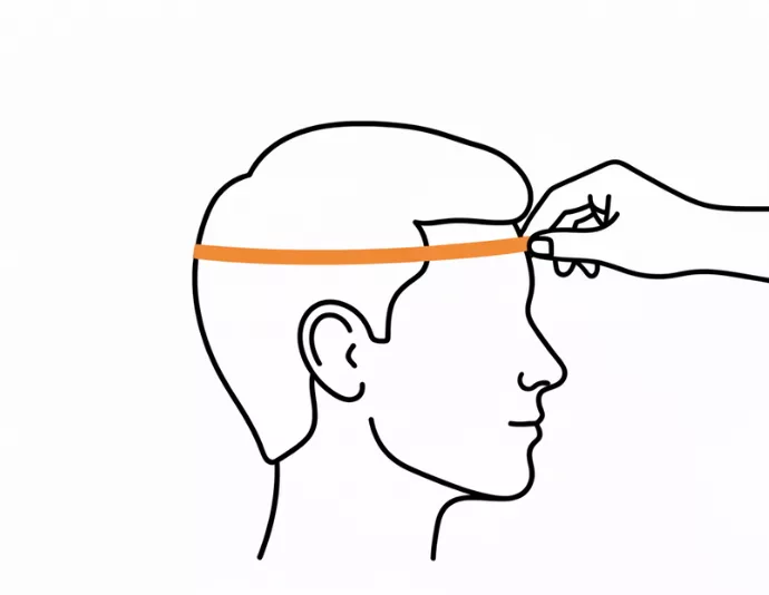 - 1. Vikl målebåndet rundt om den bredeste del af hovedet, lige over øjenbryn og ører.