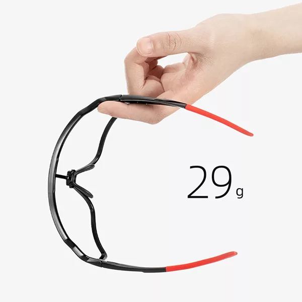THREO cykelsolbriller giver 100% beskyttelse mod UVA, UVB og UVC stråler op til 400nm. De bekæmper effektivt ultraviolet stråling og beskytter dine øjne mod skader. Brillerne er meget lette — kun 30g, hvilket reducerer trykket på næsen og tindingerne. Derudover har de en ubrudbar TR90-ramme for komfort og beskyttelse hele dagen.