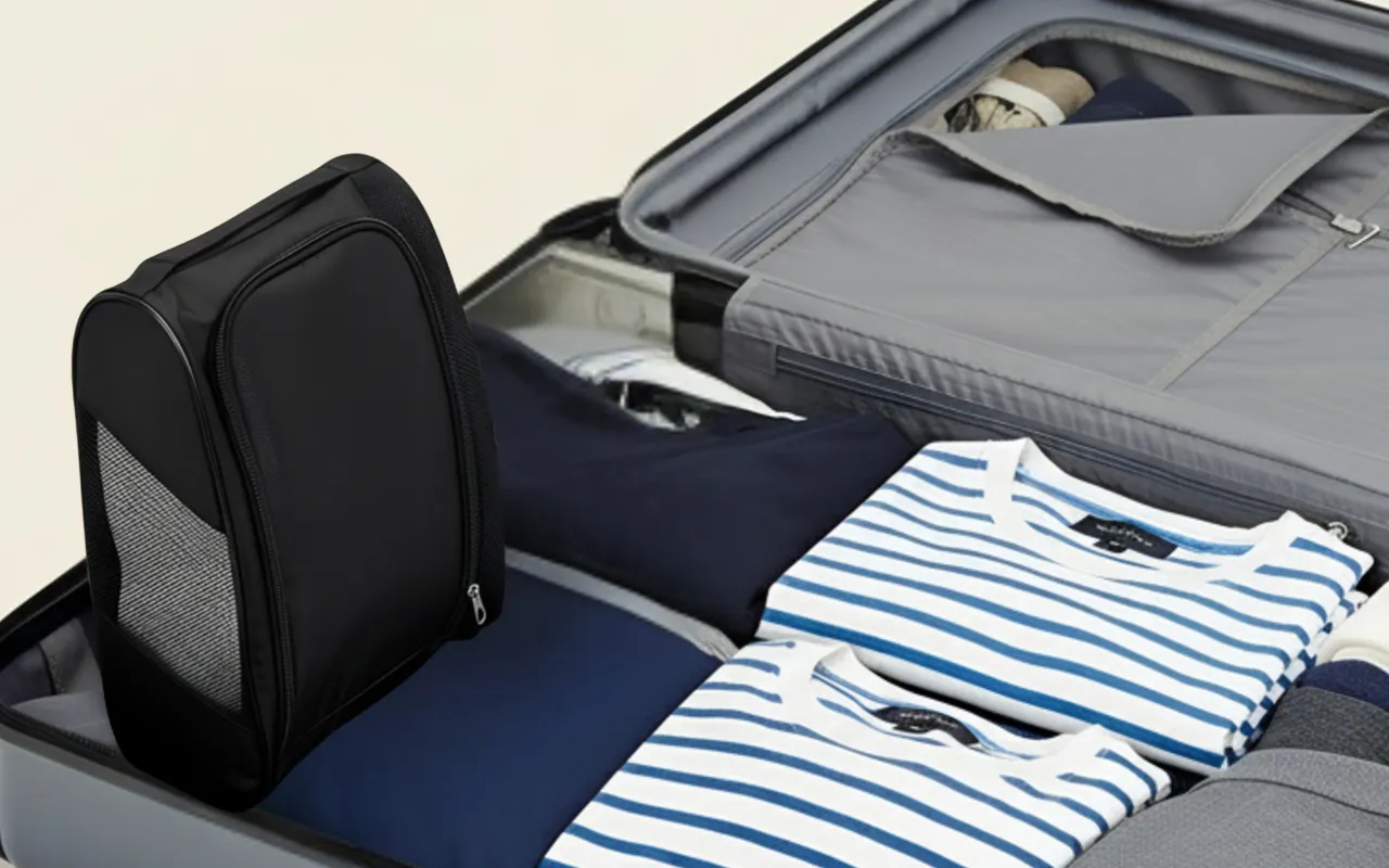 Super let og passer til begge mine sko. Det er nemt at bære dem, og når jeg åbner den, lugter mit tøj i kufferten aldrig af fødder mere!