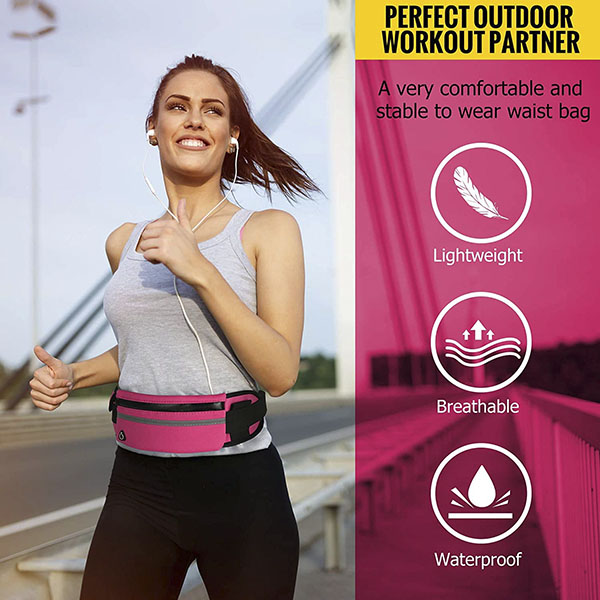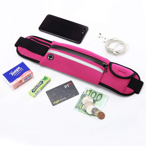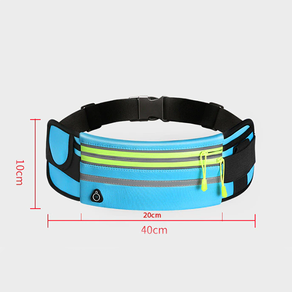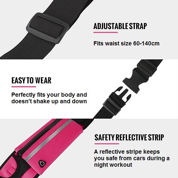 Vores løbertaske har en justerbar rem, som nemt kan tilpasses din taljestørrelse. Den har også en reflekterende stribe foran. Når den udsættes for lys i mørke, reflekterer den lyset tilbage til kilden, så du bliver synlig under dårlige lysforhold og forebygger trafikulykker.
