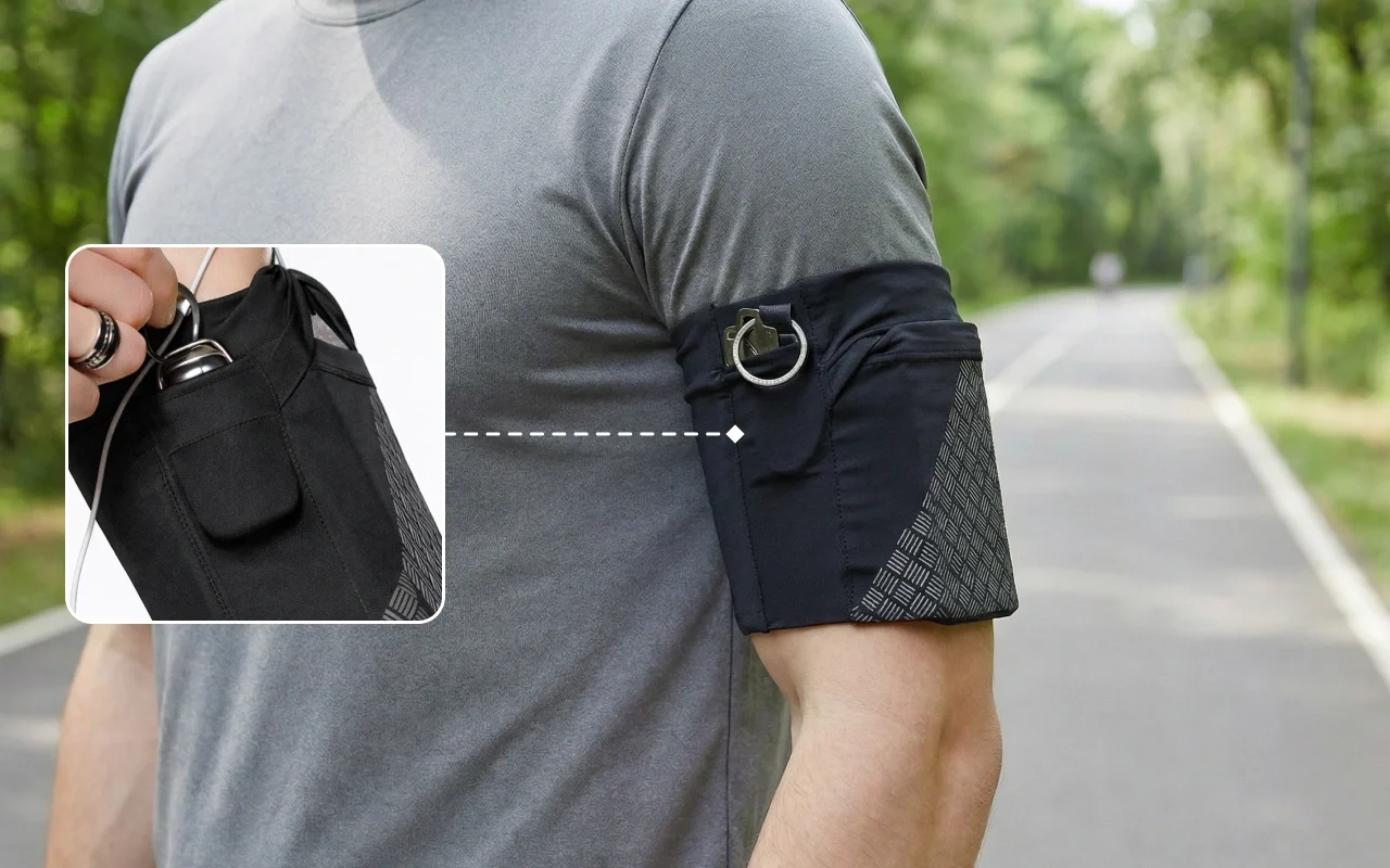 Dejligt at armbåndet sidder tæt uden at klemme. Passer til mine nøgler og lader mig høre musik mens jeg træner.