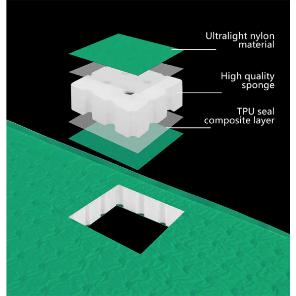 Vores campingunderlag er lavet af højkvalitets 20D nylon og en svamp indvendigt. Ydersiden er dækket med TPU-plast for ekstra beskyttelse og for at forbedre holdbarheden. Derudover har det et skridsikkert silikonedesign. Skumunderlaget vil beskytte dig mod kulde. Det giver betydelig isolering mod jordens temperatur. Selvom underlaget er selvoppusteligt, oppuster det kun nok til at give fremragende isolering, men du kan selv styre den præcise fasthed ved at puste ekstra luft i ventilen.