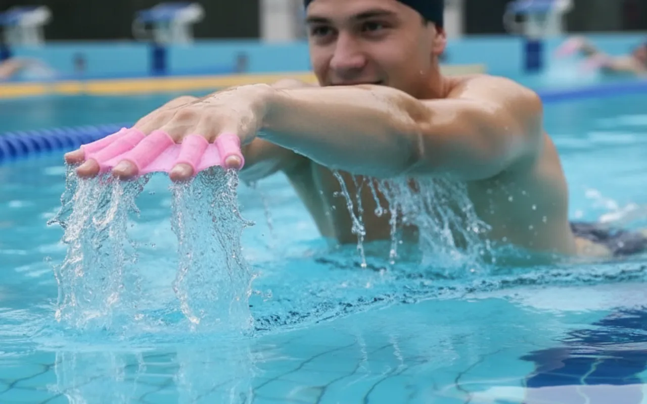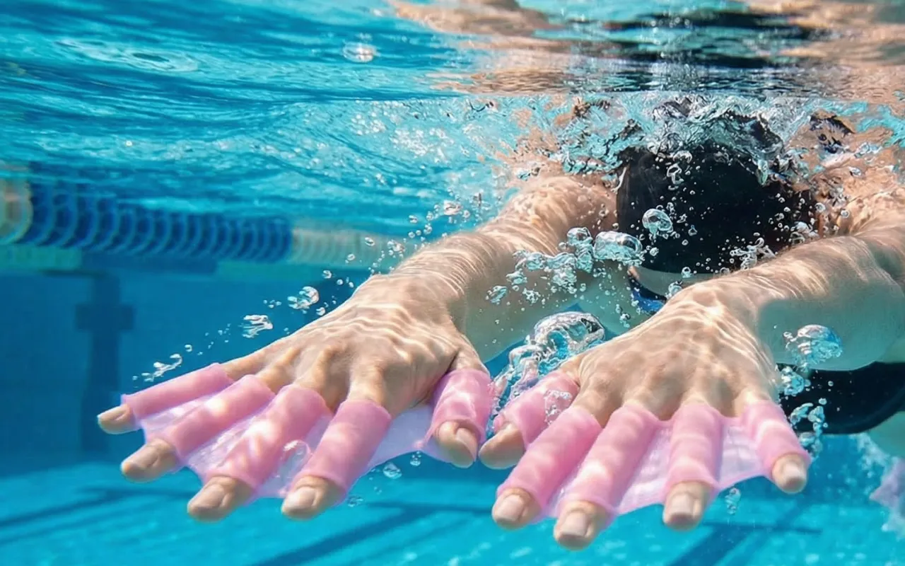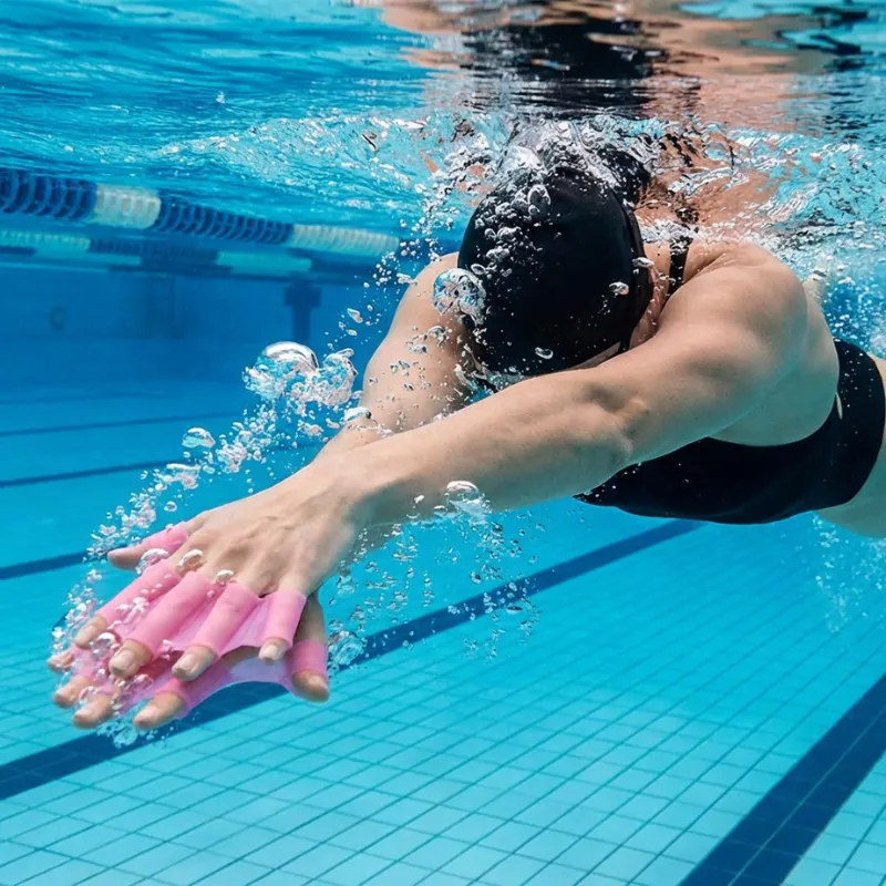 Selv i en lille hotelpool får jeg stadig en seriøs træning. Den bløde silikone strækker sig omkring mine hænder, og hvert tag sender mig glidende længere end normalt.