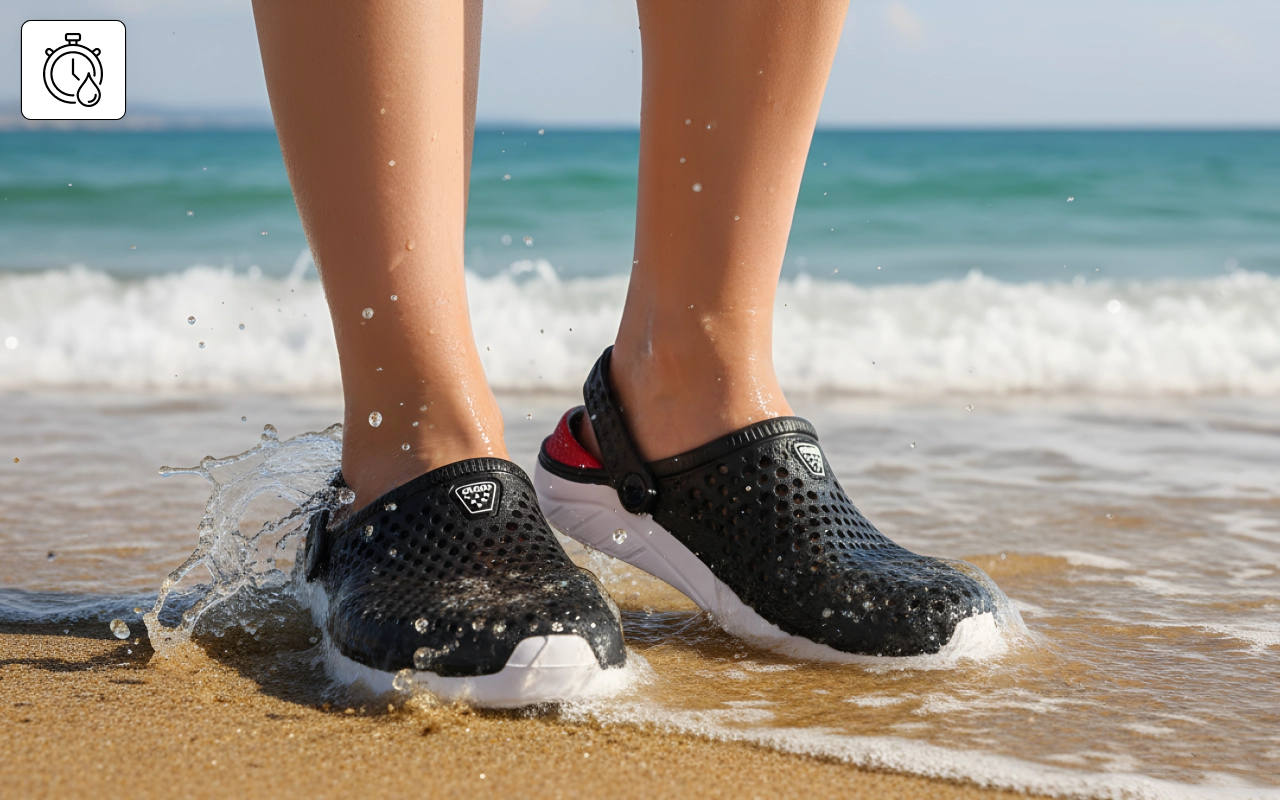 Vandet passerer frit igennem, så dine fødder holder sig friske længere. Ingen ventetid på at våde sko tørrer efter leg.