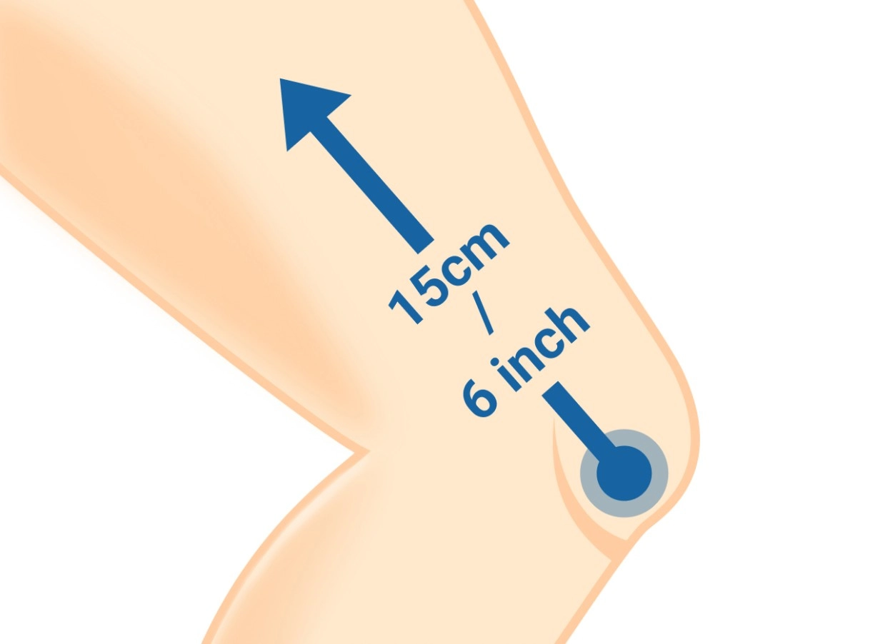 - 2. Vikl målebåndet rundt om den bredeste del af låret, cirka 15 cm/6" over midten af din knæskal.