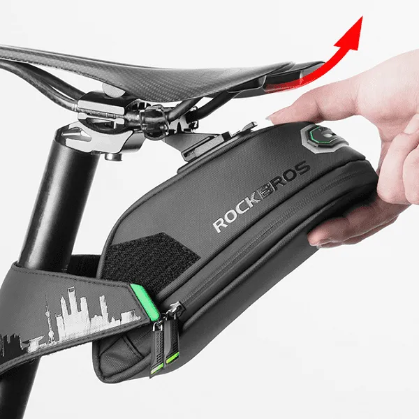 Vores cykeltaske har en gummirem, der gør det muligt at fastgøre en lygte til cykelsadlen for øget synlighed og sikkerhed på vejen under dårlige lysforhold.