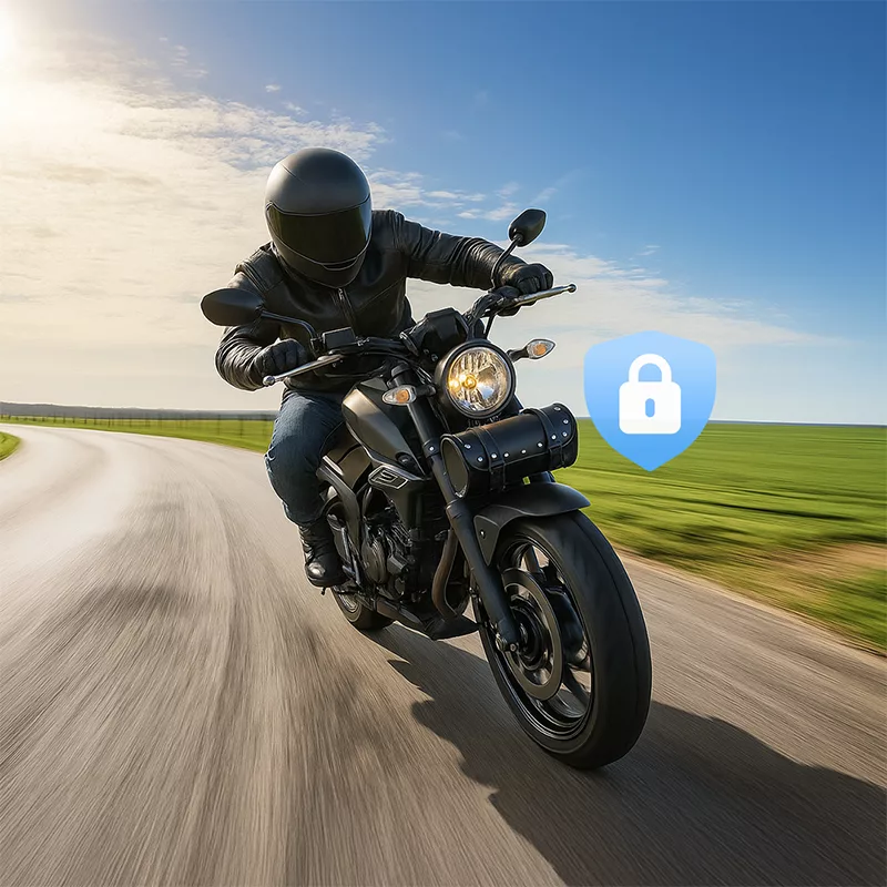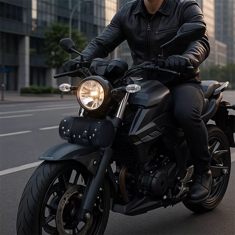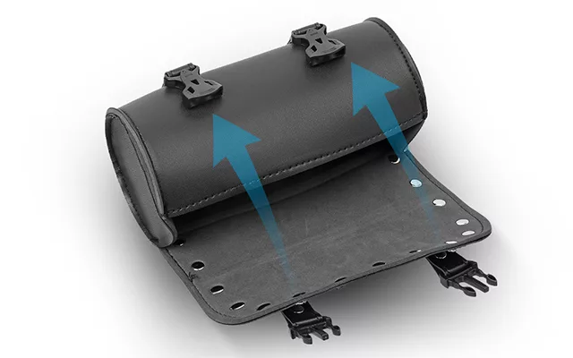 Threo tasken fastgøres nemt til de fleste motorcykelgafler med to justerbare stropper. Den forbliver sikkert på plads under kørslen, selv på ujævn vej.