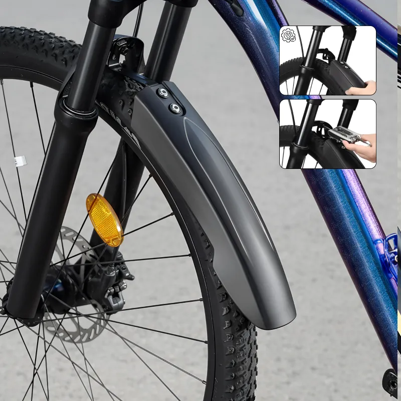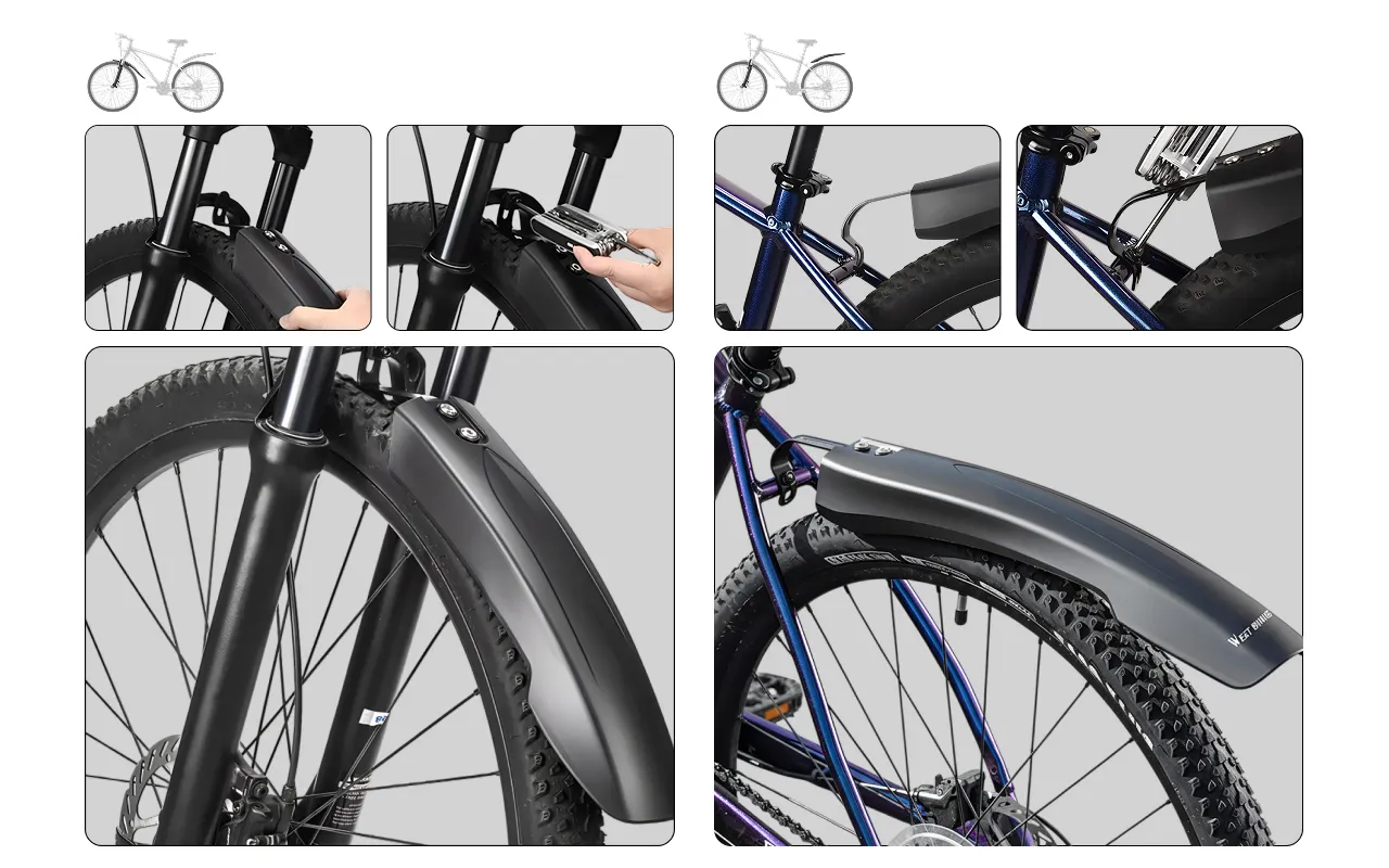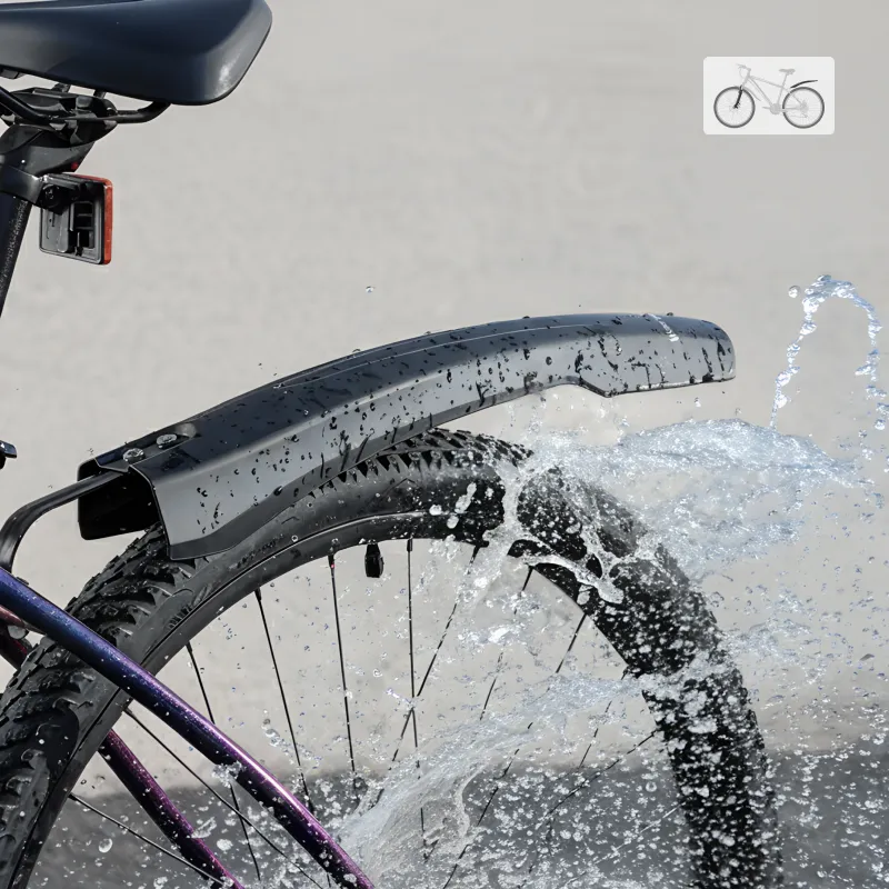 Threo-skærmsættet holder din cykel og dit tøj rent på hele turen. Det forhindrer mudder og vand i at sprøjte op på hjulene. Skærmene beskytter vigtige komponenter, hvilket forlænger deres levetid og forbedrer cyklens ydeevne. Montering er nem, så du hurtigt og uden besvær kan sætte skærmene på.
